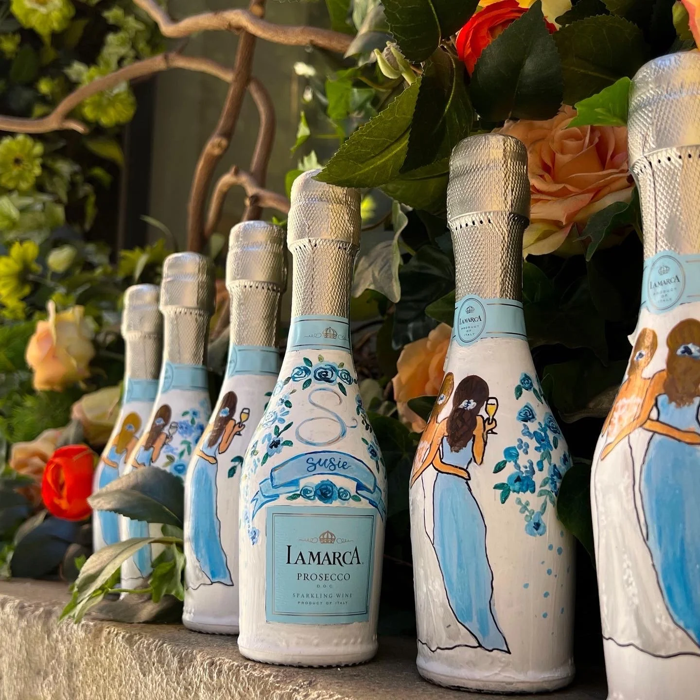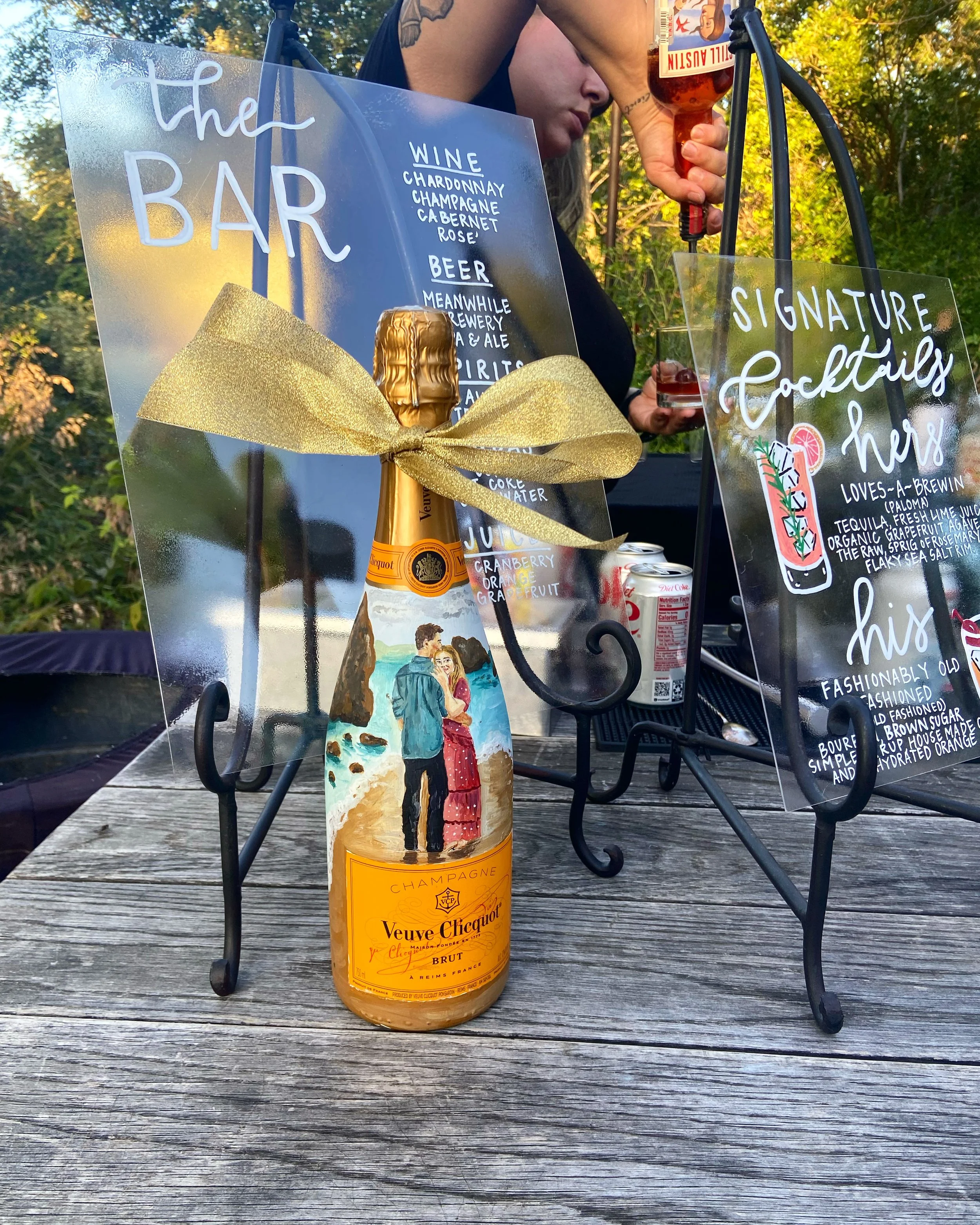 Before I begin painting, I usually have a consultation with each client. In that call or email, we discuss your specific vision for your bottle. You can tell me what you want featured on the front and back of your bottle. You can specify if you’d like hand lettering or a date. Additionally, you’re able to share reference photos, specific details, and more.