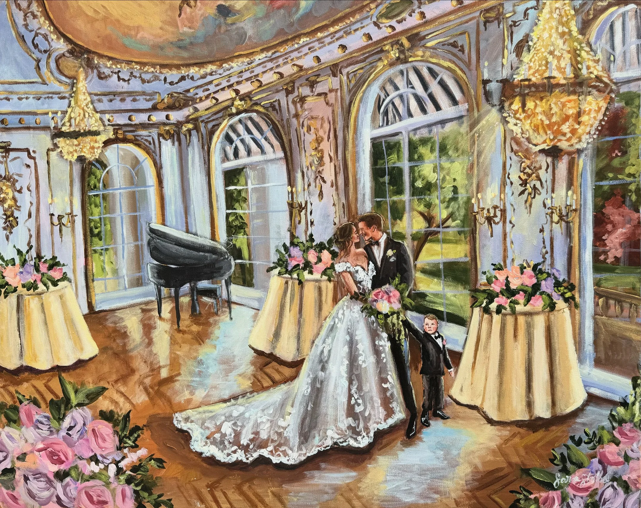 I use professional artist-grade acrylic paints. Their vibrancy and depth allow me to capture the feel and emotion of your special day. Acrylics dry quickly, which is ideal since wet paint and partying guests do not mix well. They are also archival, meaning the painting will last for generations to come!
