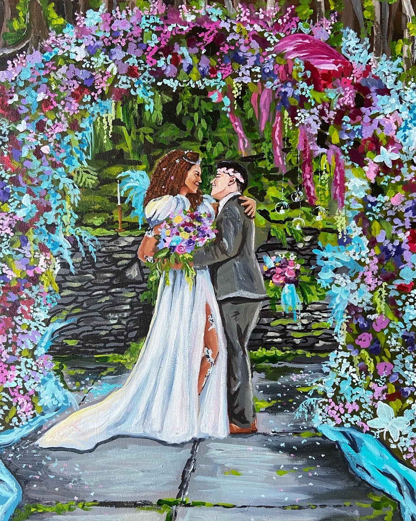 I will arrive 2-3 hours before the start of the ceremony or reception to set up and take a photo of the moment discussed during your consultation (ceremony kiss/exit, first dance, etc.). I will continue painting from photos at the reception venue so that guests can watch the painting’s progress while enjoying the party!